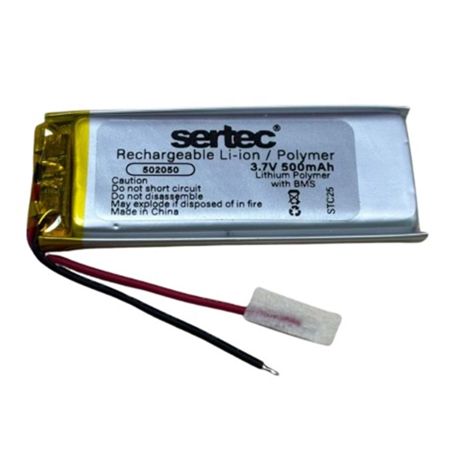 Marka : Sertec Pil boyutu : En : 20 mm Boy : 50 mm Yükseklik : 5mm Voltaj : 3.7V Kapasite mah : 500 mah Kimya : Lithium-Polymer Özellik : Devreli / 1.5A Menşei : Çin