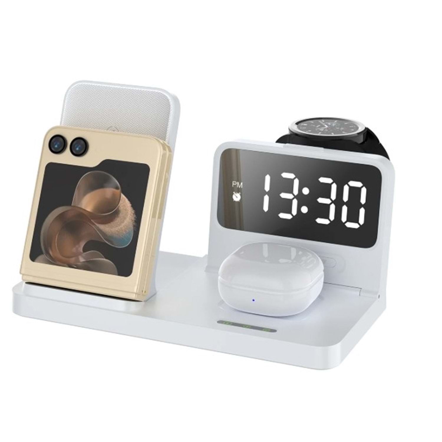 4’ü 1 Arada Fonksiyon: Telefon, kulaklık, akıllı saat ve alarm gibi dört farklı cihazınızı tek bir platformda şarj edebilir ve aynı zamanda şık bir alarm saatine sahip olabilirsiniz.